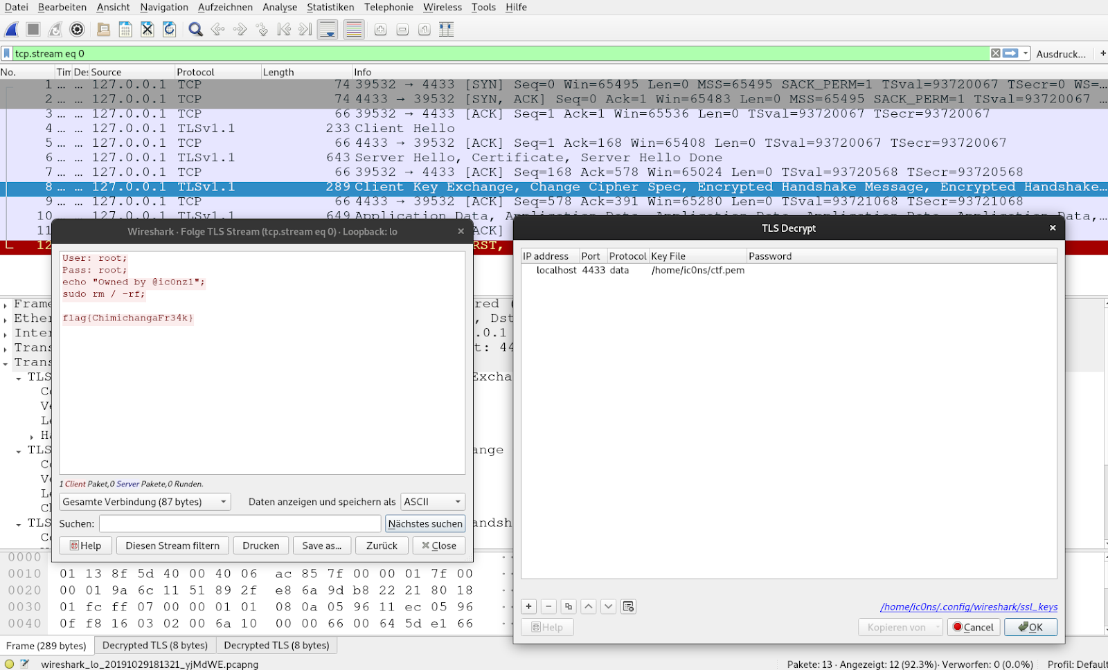 So lets analyze first what we got. We have something called a "key_block" but we do not have all parts of it. Some of the bytes have been destroyed and are unknown to us. Additionally, we have a PCAP file with some weird messages in them. Lets look at the general structure of the message exchange first.So looking at the IP address and TCP ports we see that the attacker/client was 127.0.0.1:36674 and was talking with the Server 127.0.0.1:4433. When looking at the individual messages we can see that the message exchange looked something like this: